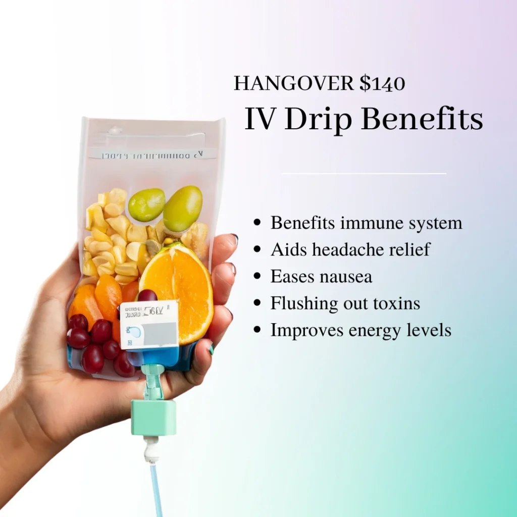 - Hangover relief – IV fluids and vitamins speed up recovery from alcohol-related dehydration and replenish depleted nutrients.